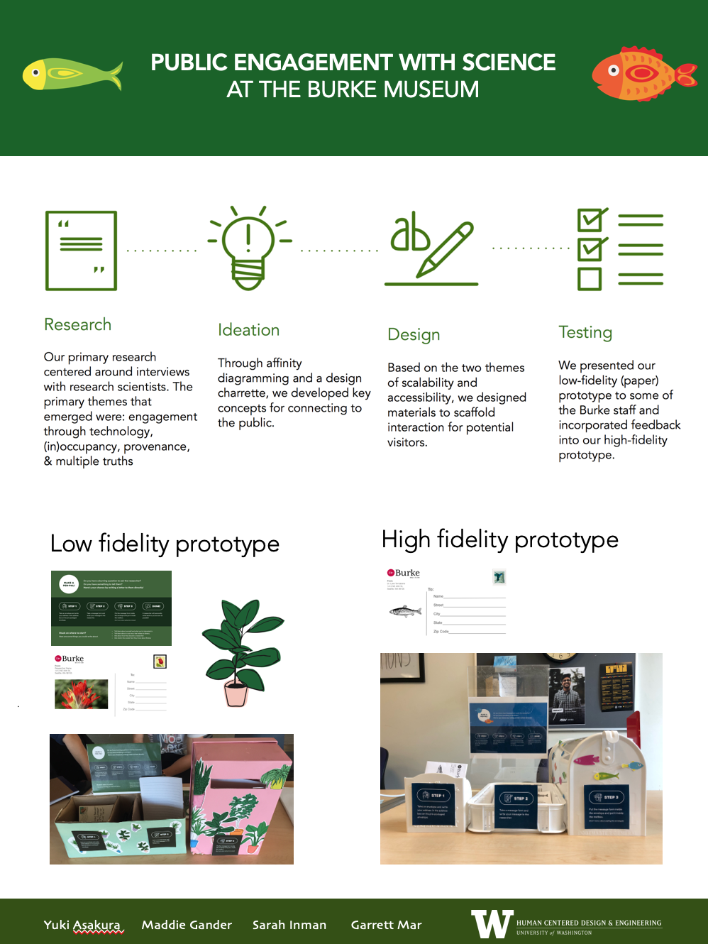 Our concept centered around a tangible object: the mailbox. To engage curiosity and encourage questions, we came up with a design for visitors to write in letters to the scientists at the museum. We tested a low-fidelity and high fidelity prototype with users and incorporated feedback into the final design. See more information in the poster below.